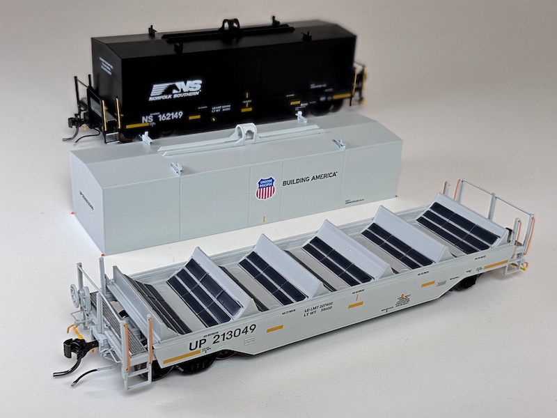 Union Pacific UP 213049 is shown with its protective cover removed revealing its load-bearing interior with five transverse troughs for steel coils (not included). Available now from Rapido Trains.