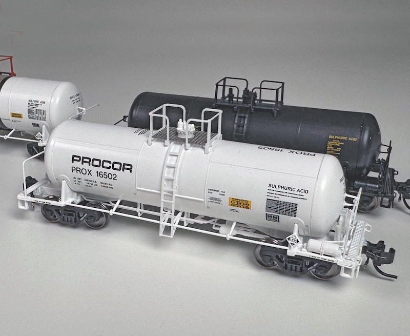 This all-white car represents a 13,855-gallon tank car built by Procor in June 1999 and assigned to sulfuric acid service. Unlike the other cars in this release, this Procor car features a bespoke three-section tank car jacket with a horizontal reinforcement bar spanning the center section underneath the vertical ladder. The air brake piping is also routed differently than the other two cars. Particularly impressive features include the nearly microscopic reporting marks printed on each truck sideframe per its prototype.
