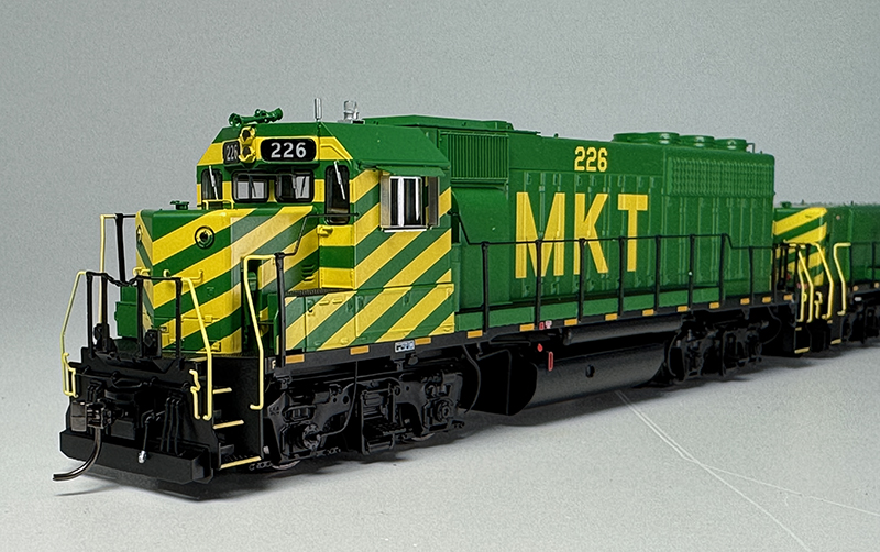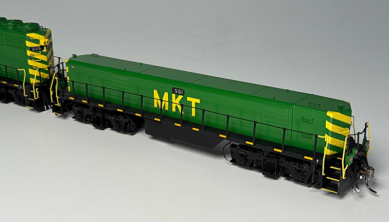 Available with the MKT and UP GP40s is a replica of MKT 501 in matching paint. MKT 501 is a slug whose prototype was rebuilt from a wrecked MKT GP40. Each slug also features lighted number boards and a precision drivetrain with can motor and flywheels driving all four axles.