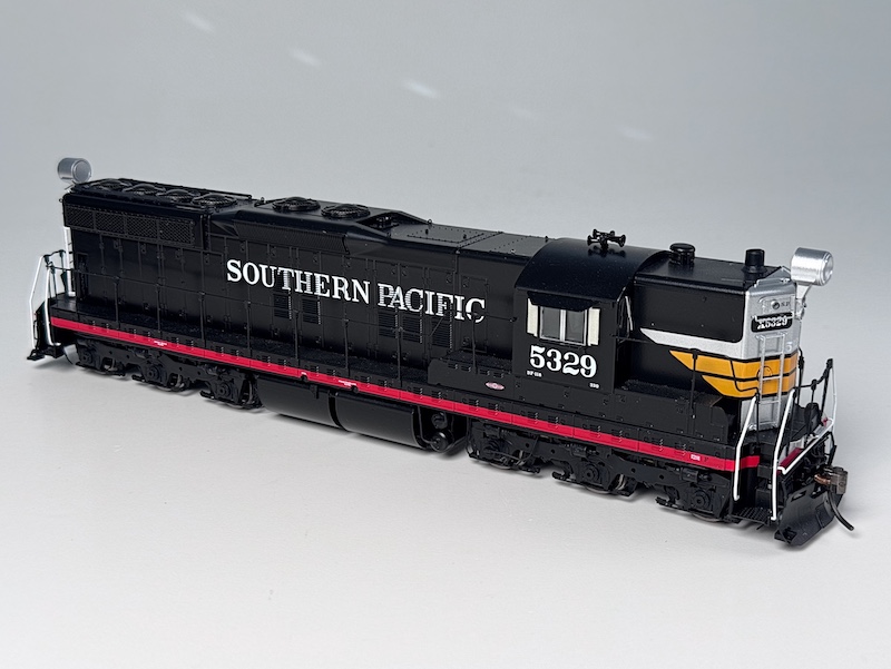 Unmistakably Southern Pacific for its two ginormous barrel oscillating lights mounted at the top ends of the hood front and rear, Rapido has delivered a striking rendition of SP’s SD7s in their as-delivered configuration in the classic Black Widow paint scheme.