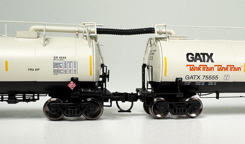 The flexible hose connection defines the TankTrain.  An entire group of interconnected TankTrain tank cars can be unloaded from a single end car.  Athearn provides realistic rubber hoses that easily slip onto the pipes at the end of each car that are flexible enough for any curve without affecting reliable operation.