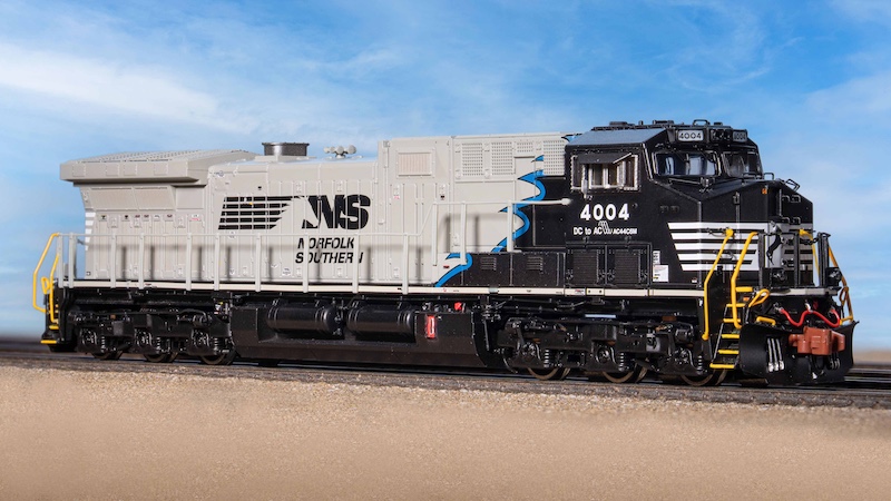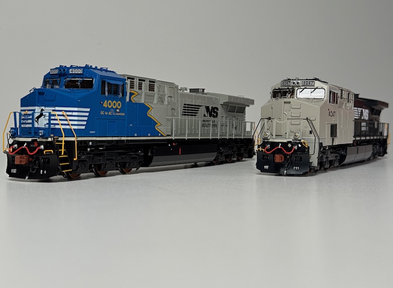 Liveries for both scales also include replicas of AC44C6Ms delivered to the Norfolk Southern with operator cab and forward section of the long hood still in primer.