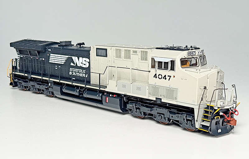 Available now from ScaleTrains is its first release of GE AC44C6M diesels for HO scale. As is customary of their “Rivet Counter” series, this all-new model bristles with class-leading detail throughout, especially under the side sills. Each model is detailed and decorated precisely to replicate each road number for a specific era. The unit numbers chosen for this review are NS 4000 and NS 4047. At first glance, the two samples that we received may seem identical beyond the paint, but ScaleTrains has taken pains to replicate details specific for each road number. Visual disparities between the 4000 and 4047 replicated in model form include different air horn clusters, cab mirror arrangements, lift ring styles and placement, disparate styles of right-side radiator wing access doors, stamped versus concave brake wheels, different handrail stanchion styles, and more.
