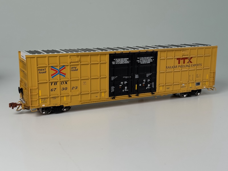 ScaleTrains’ Rivet Counter Trinity 7500 boxcar for TTX is a finely crafted replica of TTXs TBOX series 672500-673049 built between August and December of 2018. Notable spotting features on these cars include seven vertical posts to either side of the doors, three horizontal stiffeners along the side of the car, double 8-foot wide plug doors, 3 over 2 non-terminating ends, and more.